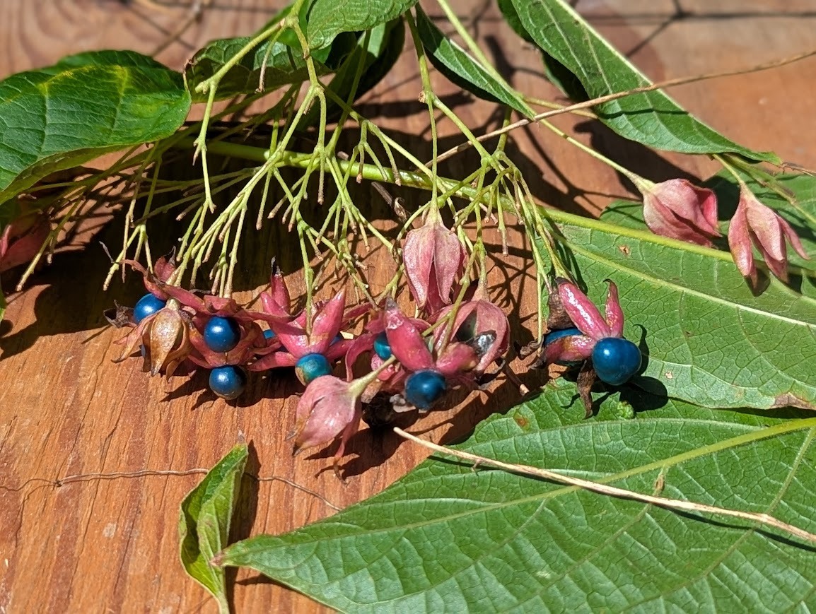 葉っぱから少し独特な香りがするので『臭木』という名前ですが、そんなにいやな匂いでもありません。それよりも、お花を咲かせてから実が熟していったあとの、実がとても美しいのです。