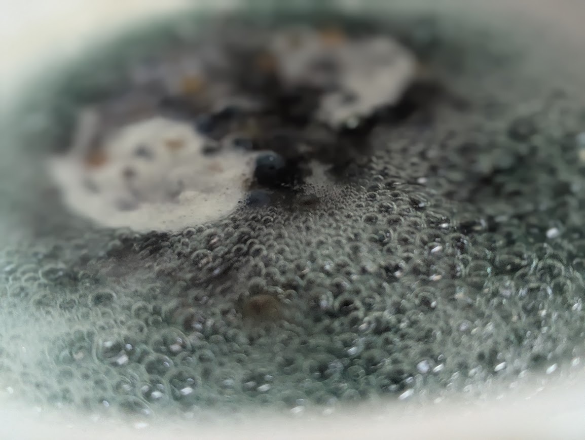 クサギの実は煮だしていると、鍋のなかでは、どんどん緑がかったような青い色が現れて、あぶくとともに渦が巻いて、ちいさな地球かのような神秘的な様子が見られます。