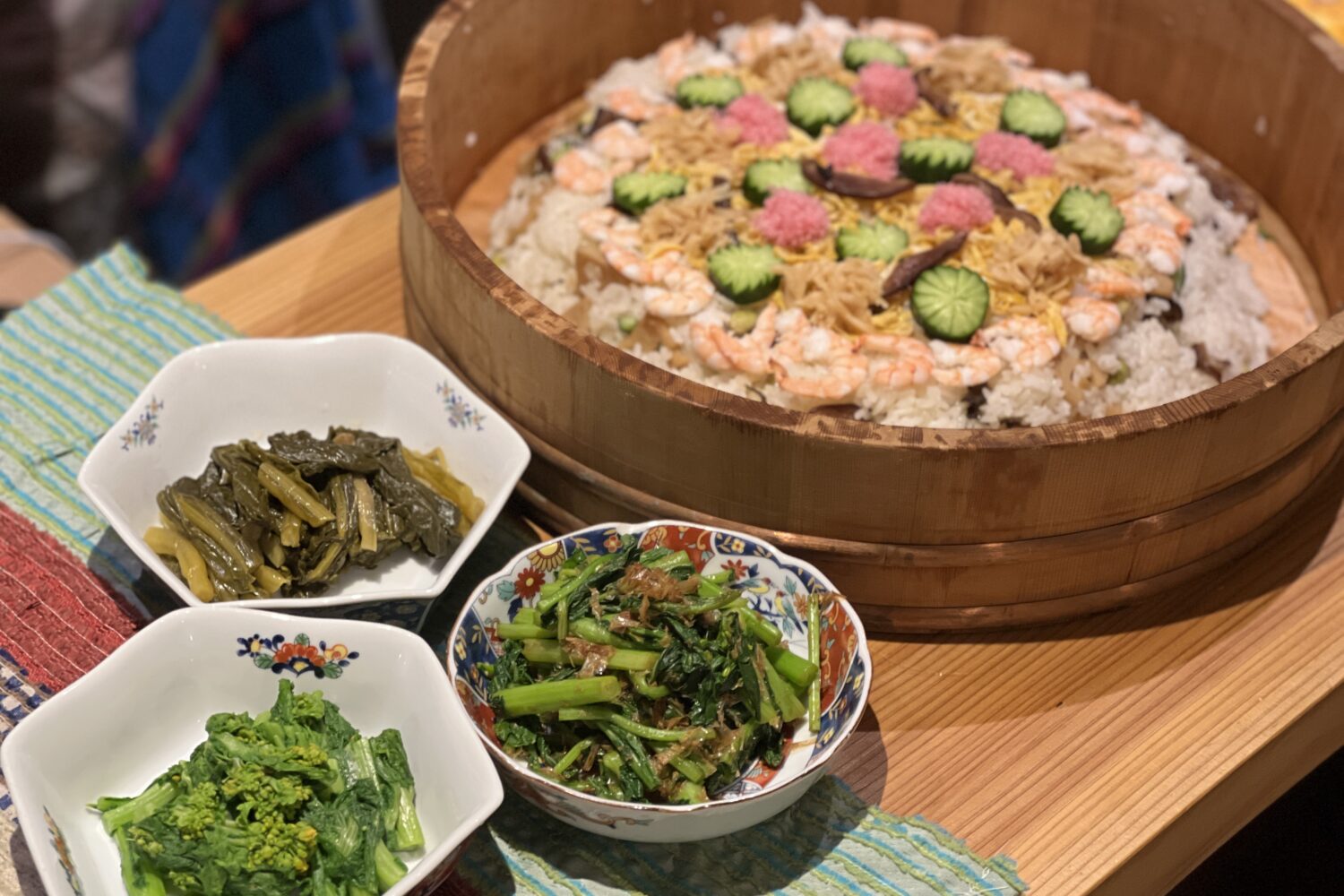 ちらし寿司には海老や椎茸、蓮根、豆、錦糸卵に加え、桜でんぶや飾り切りしたきゅうりでより華やかな装いに。